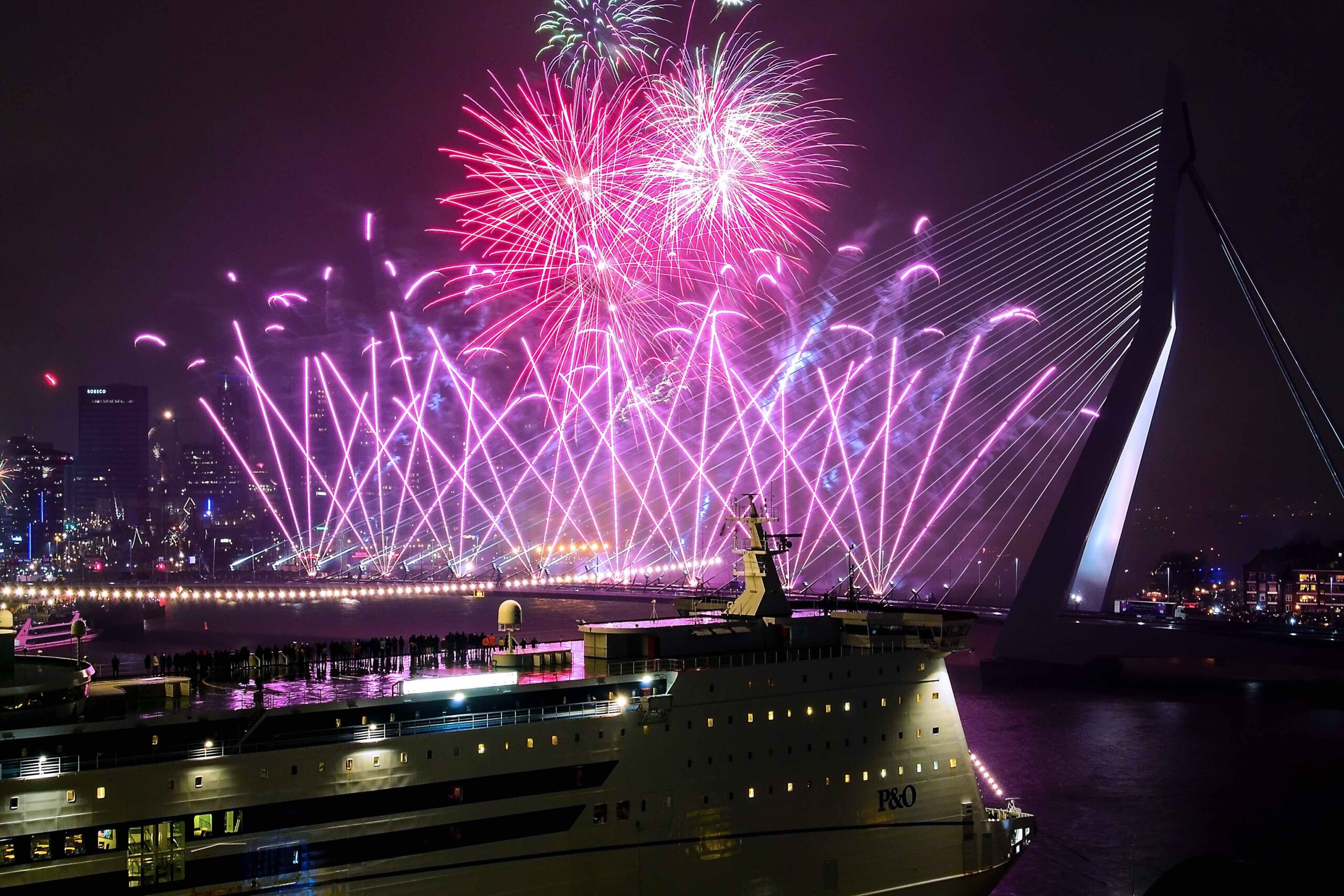 You can see the fireworks across the whole city for free, but the best view is from the Boompjeskade also for free. On the Boompjeskade we have a big countdown at 00:00 with 60.000 people!